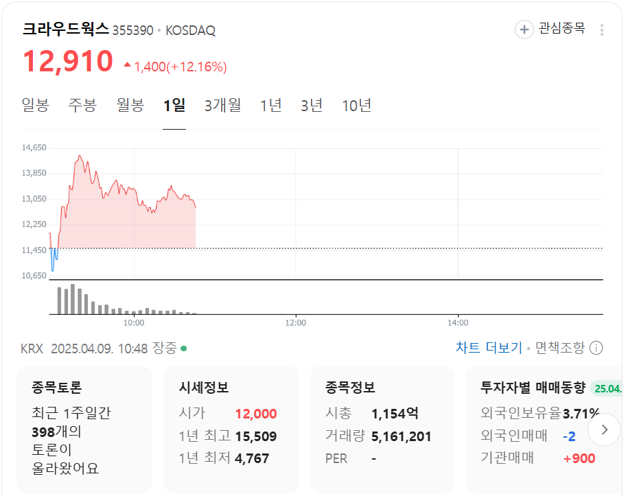 2025년 4월 8일 기준으로 크라우드웍스의 주가는 최근 AI 산업에 대한 관심과 정책적 이슈로 인해 변동성을 보이고 있습니다. 예를 들어: