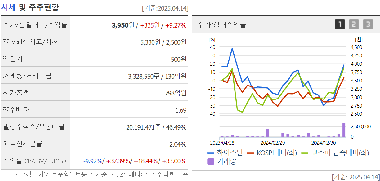 하이스틸은 글로벌 철강 수요 증가와 고부가가치 제품 개발을 통해 중장기 성장 가능성을 가진 종목입니다.