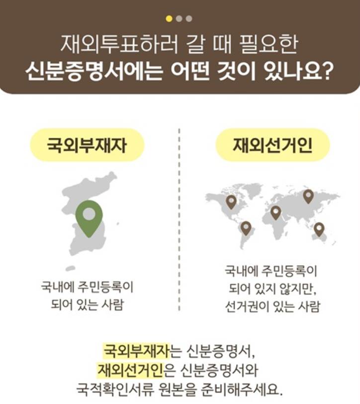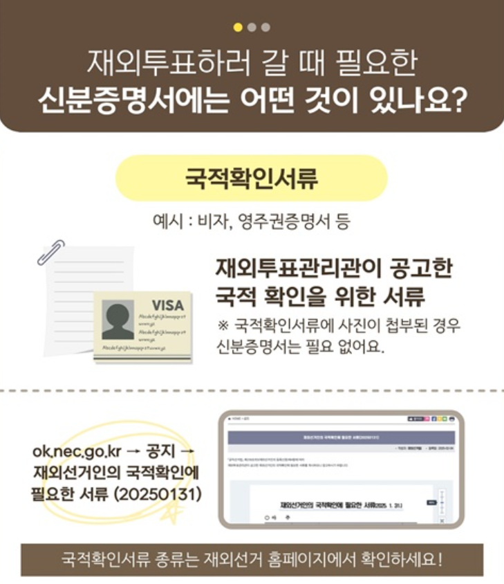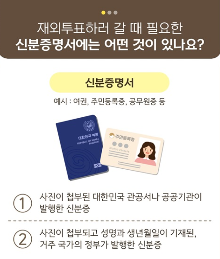 - 재외선거인: 신분증 및 국적 확인 서류(예: 여권, 재외국민등록부 등).
