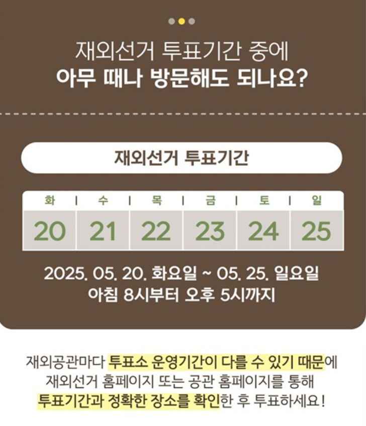 - 특징: 투표소 운영 기간은 공관별로 다를 수 있으므로 사전 확인 필수.
