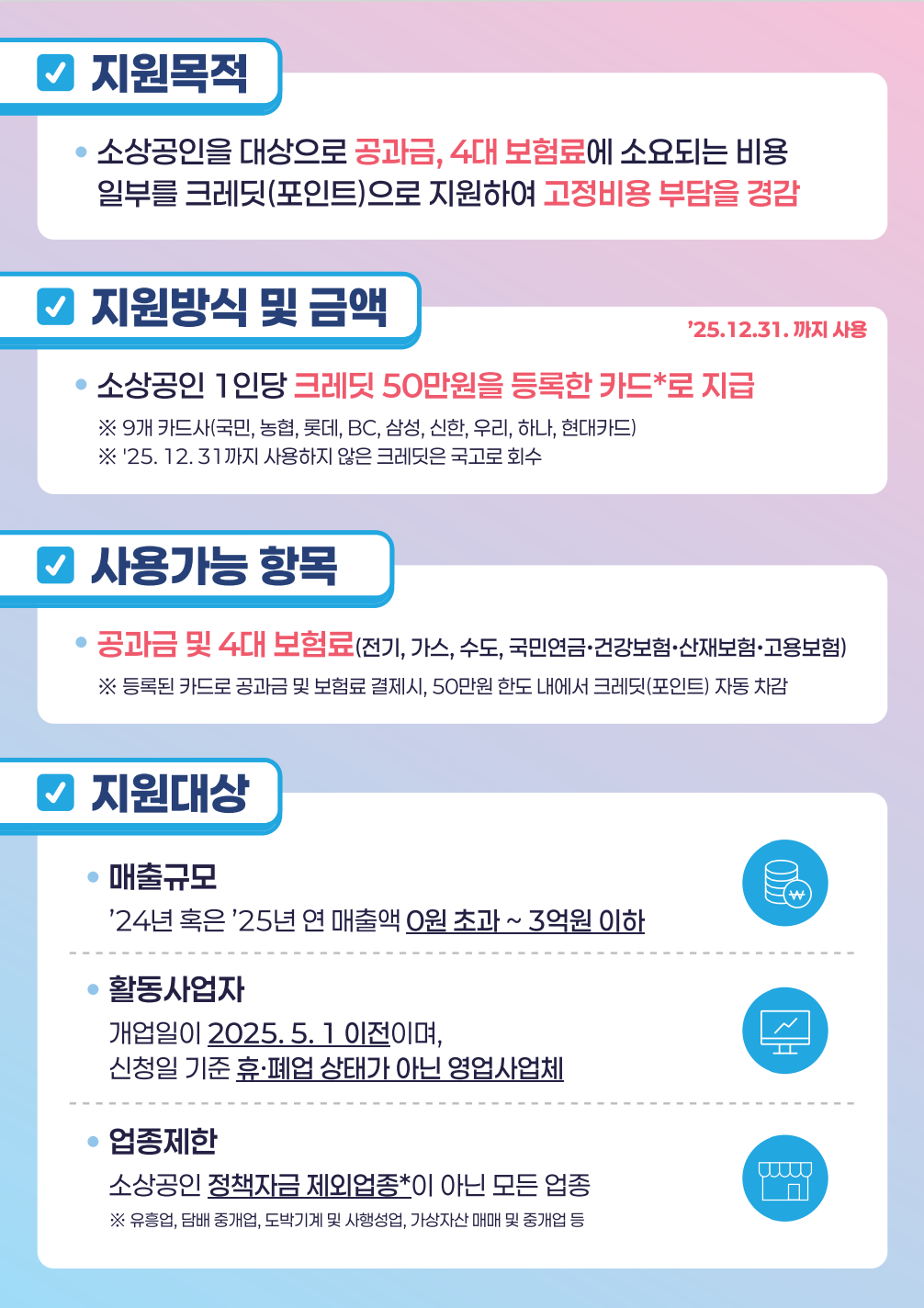 소상공인이 매달 부담하는 공과금과 4대 보험료를 덜어주기 위한 제도입니다.