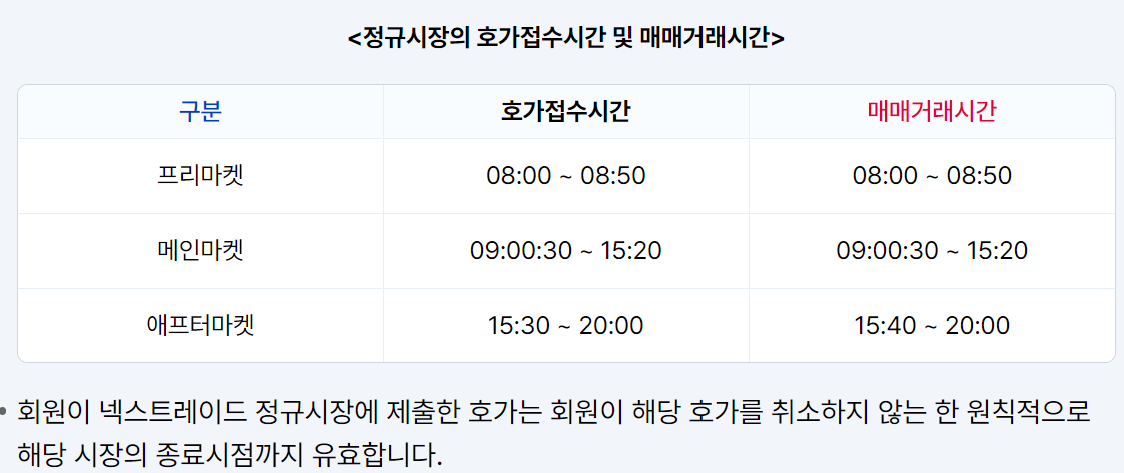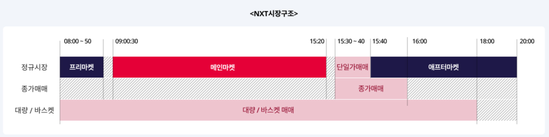 | 프리마켓 | 오전 8시 ~ 8시50분 | 오전 8시 ~ 8시50분 | KRX와 분리 운영 |